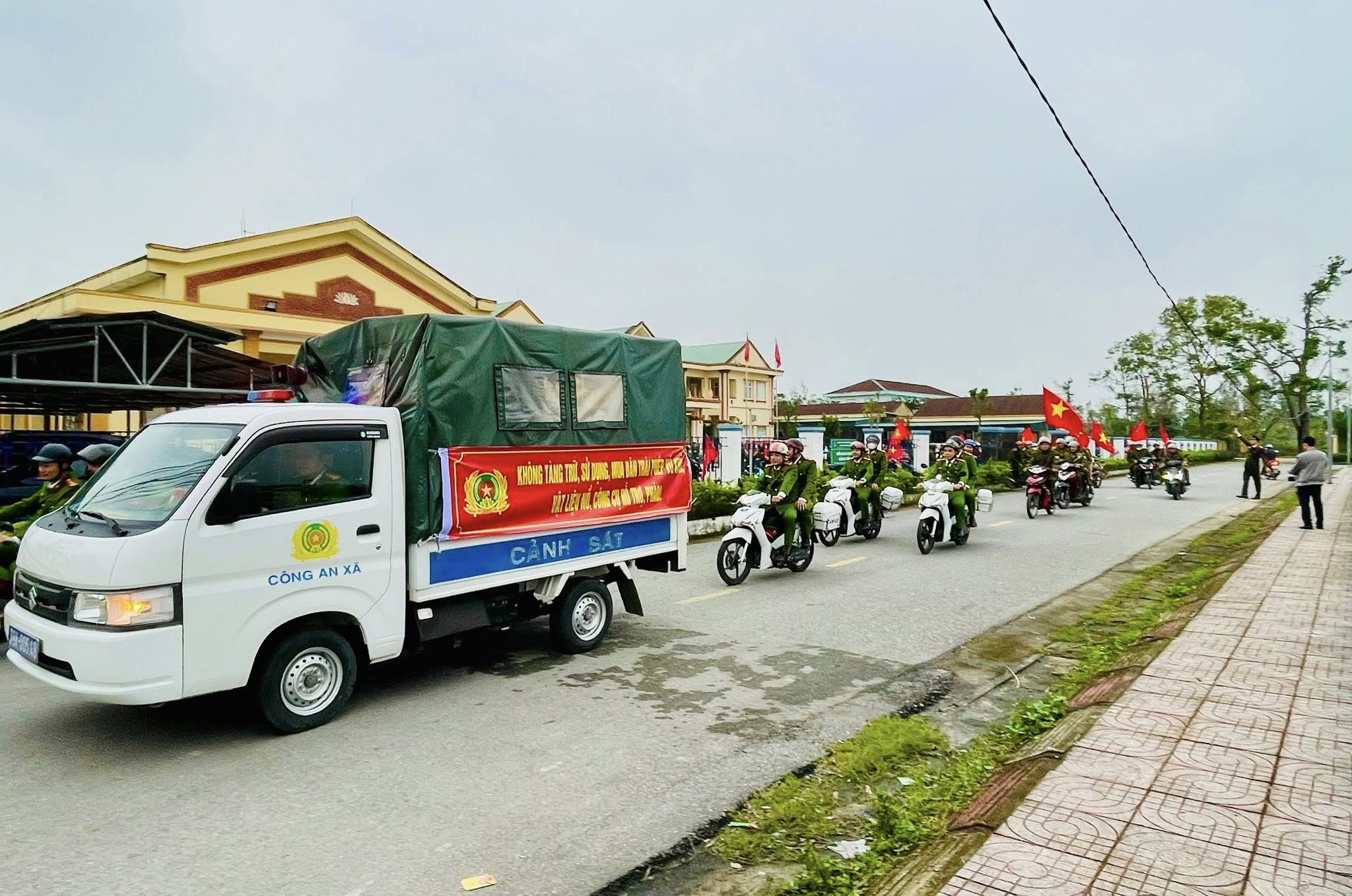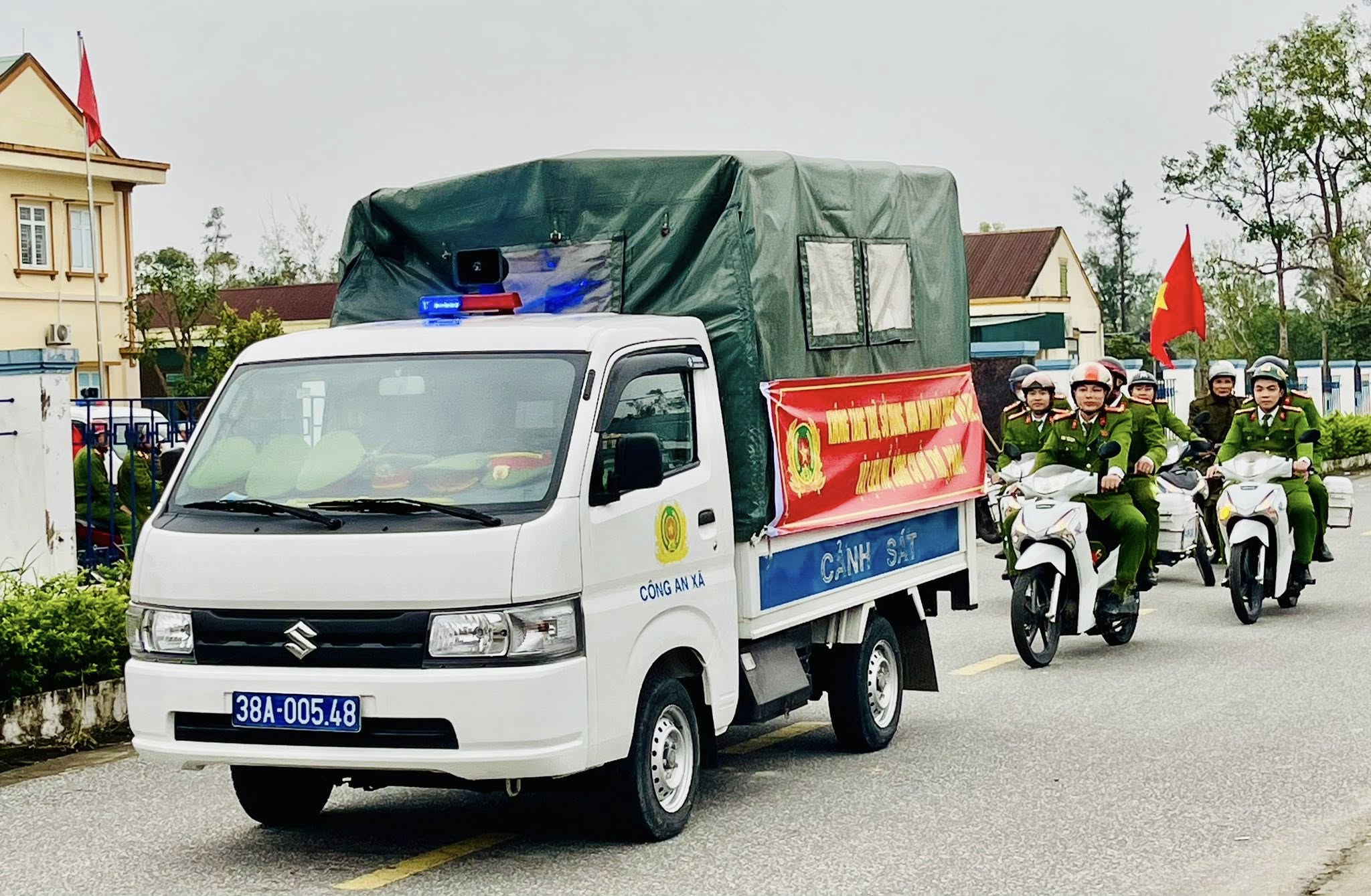 Sau lễ ra quân lực lượng Công an xã Đồng Tiến đã diễu hành biểu dương lực lượng trên trục đường chính của xã.