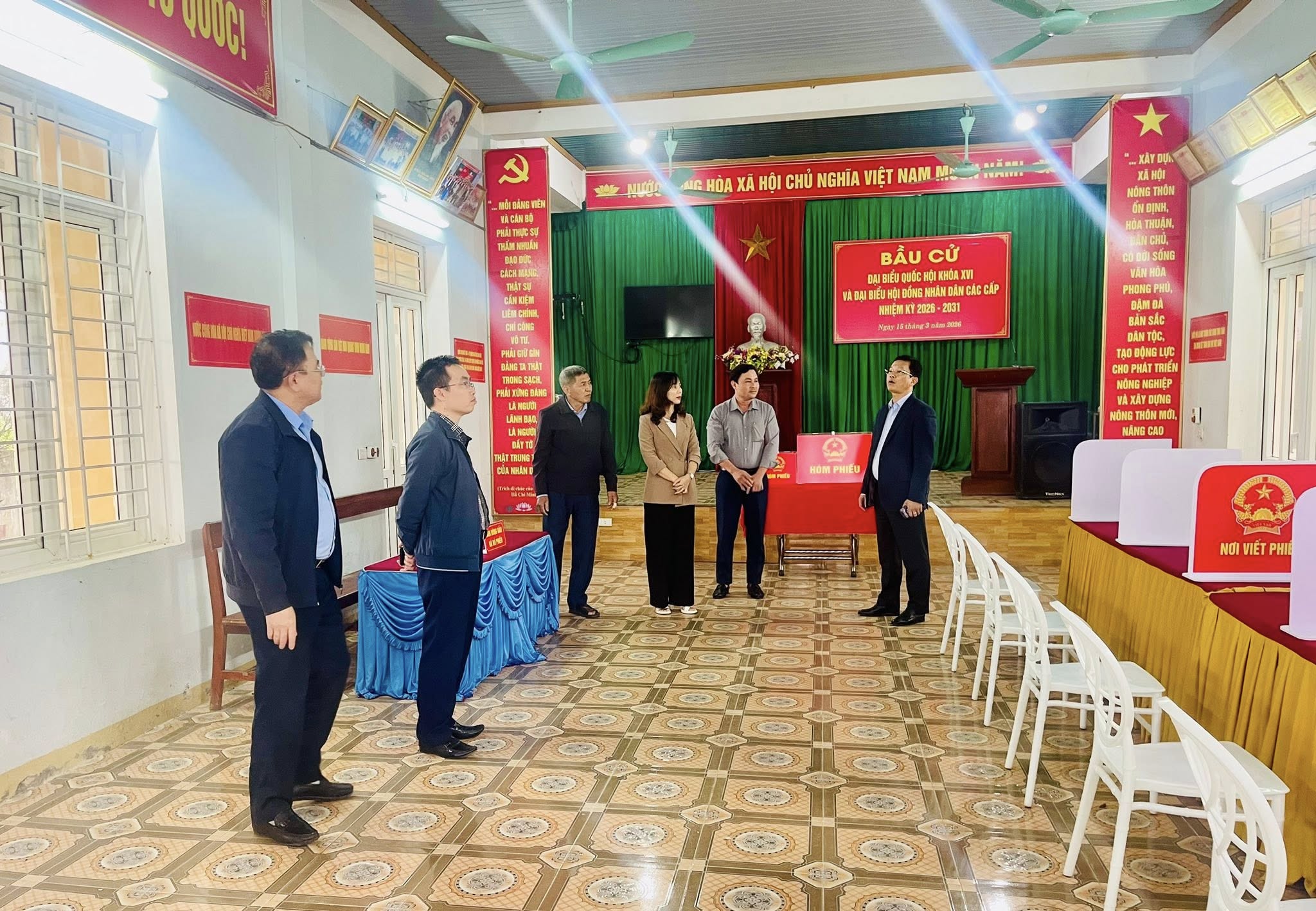 Tại xã Đồng Tiến, đoàn đã trực tiếp kiểm tra công tác chuẩn bị tại điểm bầu cử thôn Bắc Trị, bao gồm việc niêm yết danh sách cử tri, danh sách và tiểu sử tóm tắt của các ứng cử viên, công tác trang trí khánh tiết, chuẩn bị cơ sở vật chất, hòm phiếu, khu vực bỏ phiếu cũng như các điều kiện phục vụ cho ngày bầu cử.