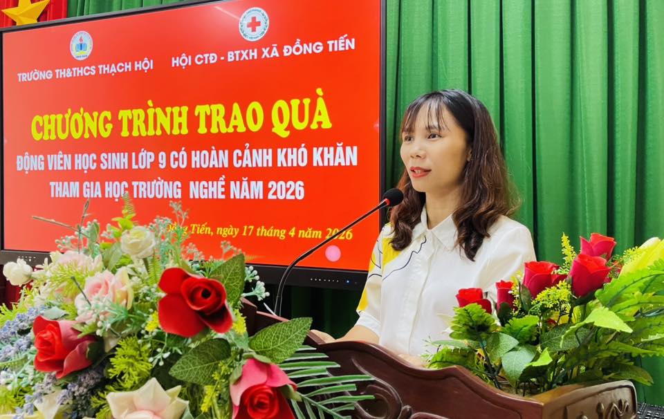 Phát biểu tại chương trình, đồng chí Nguyễn Thị Như Ngọc - Bí thư Đảng ủy, Chủ tịch HĐND xã đã ghi nhận và đánh giá cao sự phối hợp giữa Hội Chữ thập đỏ – Bảo trợ xã hội và nhà trường trong công tác chăm lo cho học sinh có hoàn cảnh khó khăn. Đồng thời nhấn mạnh, việc định hướng học nghề cho học sinh sau khi tốt nghiệp THCS là hướng đi phù hợp với thực tiễn, giúp các em sớm có tay nghề, có việc làm ổn định, góp phần phát triển kinh tế gia đình và địa phương.Đồng chí Bí thư Đảng uỷ cũng bày tỏ mong muốn các em học sinh nỗ lực vươn lên trong học tập, rèn luyện kỹ năng, tự tin lựa chọn ngành nghề phù hợp để xây dựng tương lai.