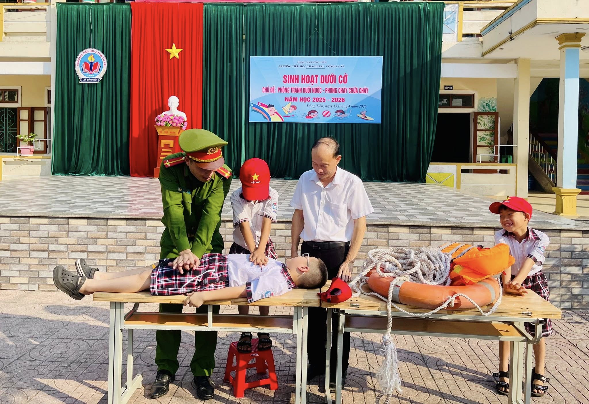 Cán bộ Công an xã tuyên truyền hướng dẫn phòng chống đuối nước, phòng cháy chữa cháy cho các em học sinh