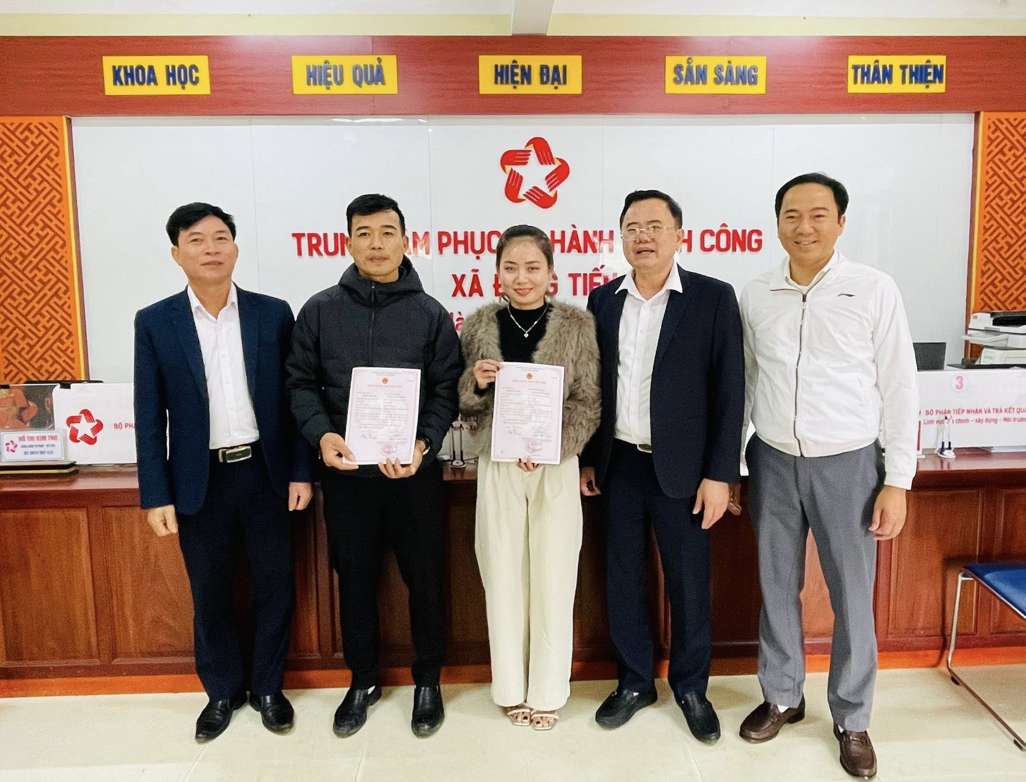 Đồng chí Nguyễn Văn Huyên – Phó Bí thư Đảng ủy, Chủ tịch UBND xã; đồng chí Trần Đức Việt – Ủy viên Ban Thường vụ Đảng ủy, Phó Chủ tịch UBND xã, cùng lãnh đạo Trung tâm Phục vụ hành chính công xã chụp hình lưu niệm với vợ chồng anh Nguyễn Quốc Hoàng và chị Hoàng Thị Liễu sau khi nhận giấy kết hôn và thư chú mừng của chính quyền địa phương