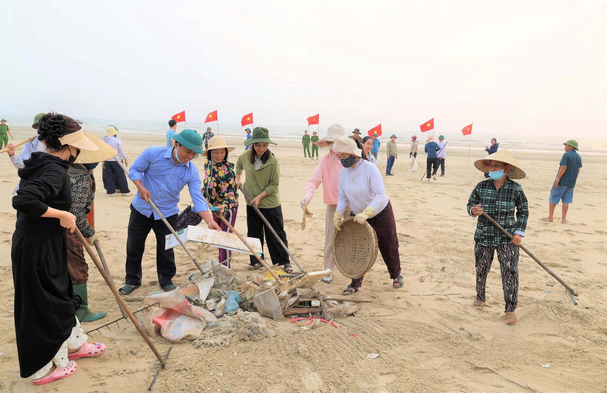 Ngày từ sáng sớm, trong không khí sôi nổi, đông đảo cán bộ, công nhân viên, người lao động, cùng lực lượng, Công an,BCH Quân sự xã, giáo viên, học sinh và nhân dân đến từ các thôn ven biển gồm thôn Đại Tiến, Toàn Thắng, Đông Văn và Hội Tiến đã tích cực tham gia thu gom rác thải, phát quang, làm sạch bãi biển.