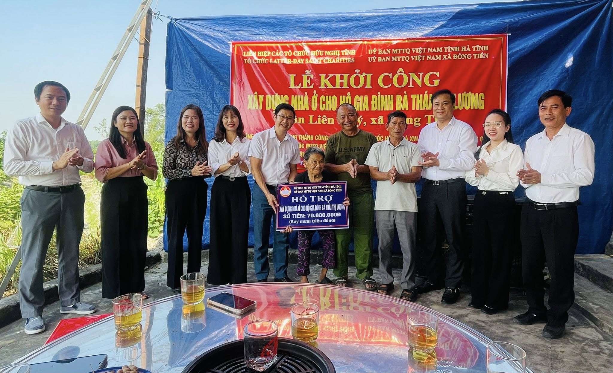 Lãnh đạo địa phương và nhà tài trợ trao biểu trưng hỗ trợ 70 triệu đồng cho bà Lương