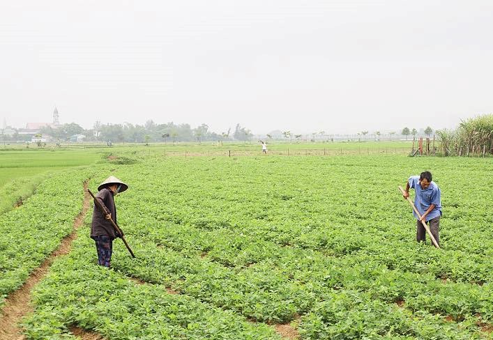 Nông dân xã Đồng Tiến làm cỏ cho lạc xuân
